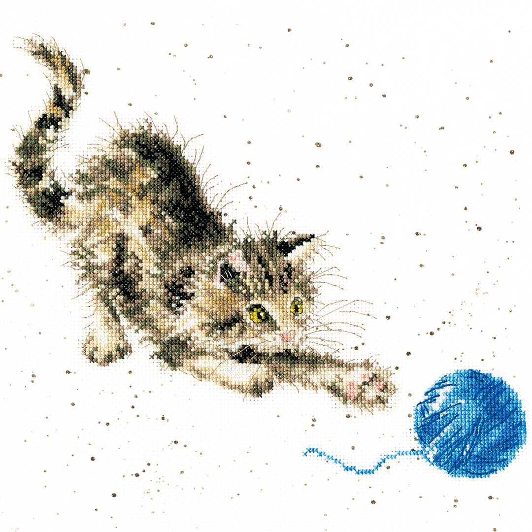 【キット作り方つき】毛糸玉と戯れる子ネコを描い た、可愛らしいクロスステッチ作品。しぶきを散らしたような地模様つきのアイーダに刺す、中級の方向きデザインですBothy Threads社製(ボシー・スレッズ)