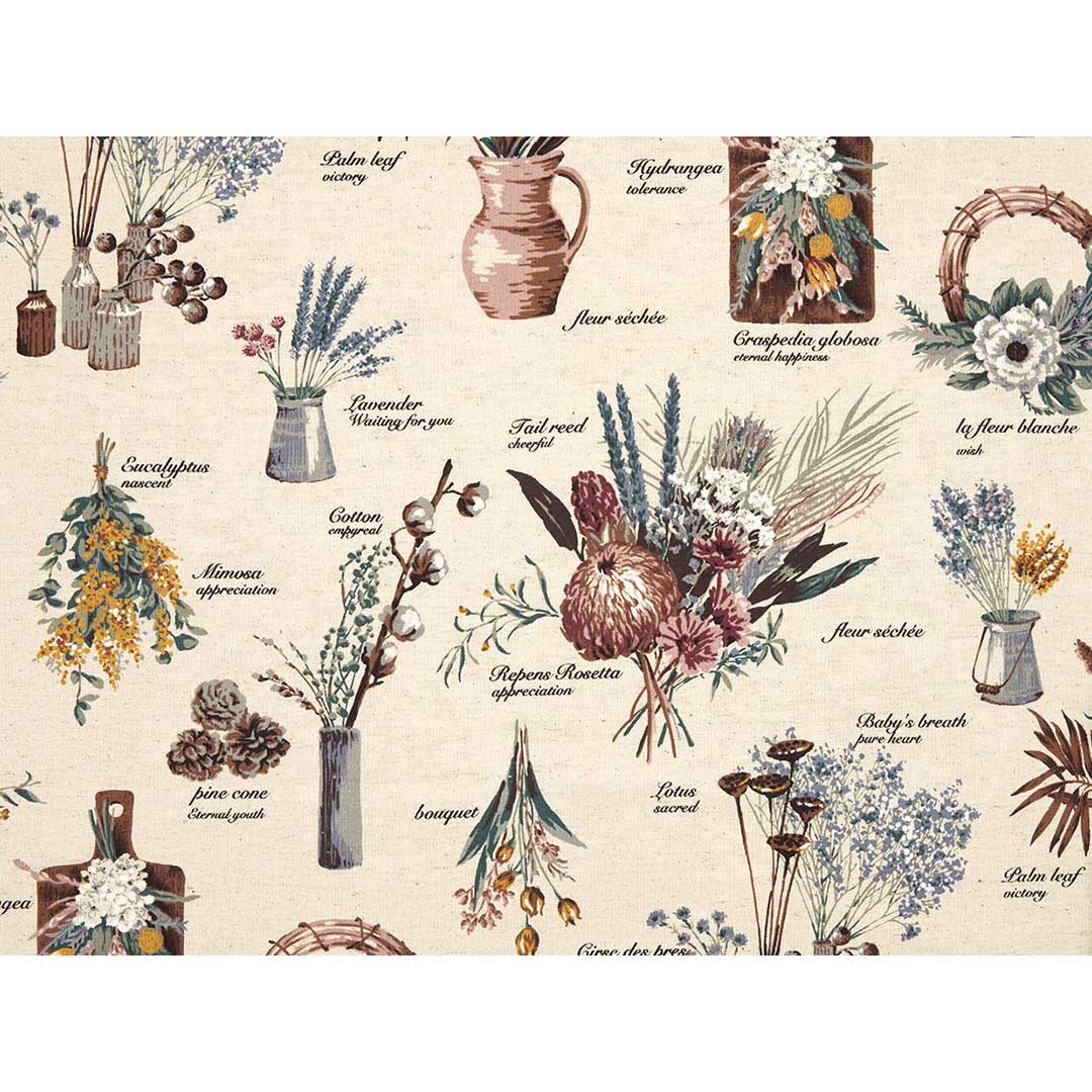 【綿麻キャンバス】やや厚手のキャンバス地。綿殻入りの綿麻地に、いろいろなドライフラワーを描いたやや大柄の布。インテリアやバッグなどに。