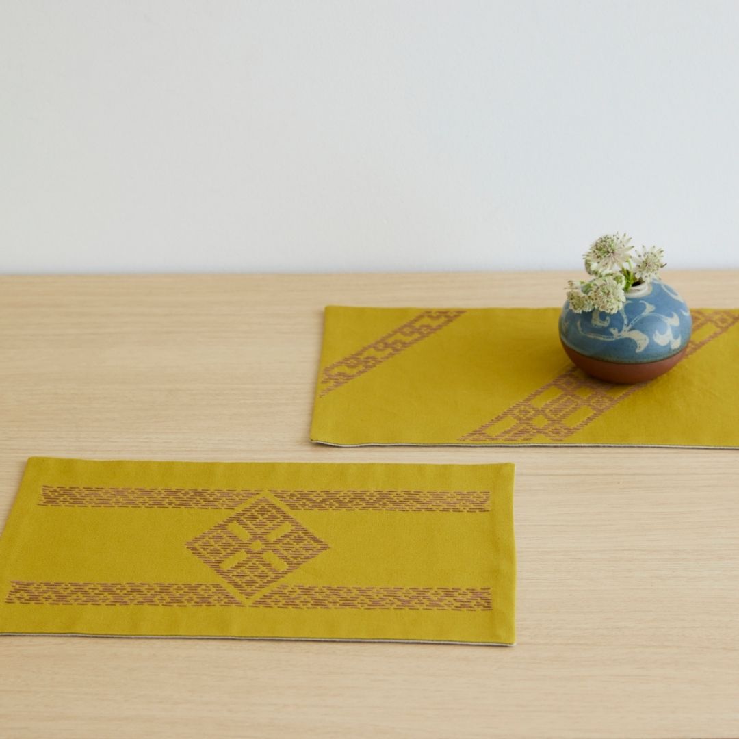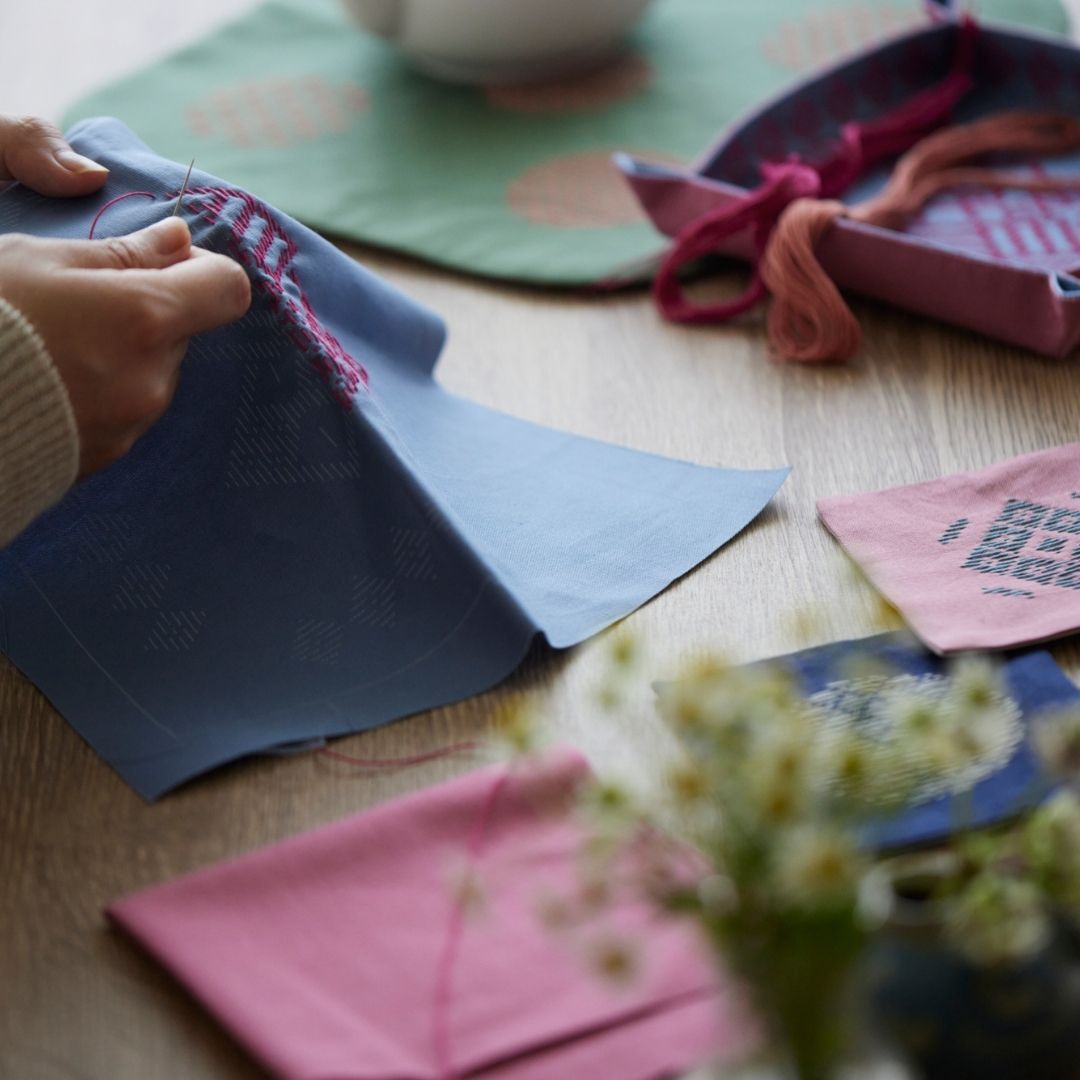 「こぎん刺し」は本来、布の織り目を数えながら刺し進めて模様を作る技法ですが、本キットでは、下絵が印刷された布になみ縫いの「刺し子」の技法で縫い進めていくことで、こぎんの伝統文様を気軽に楽しめるようになっています。
