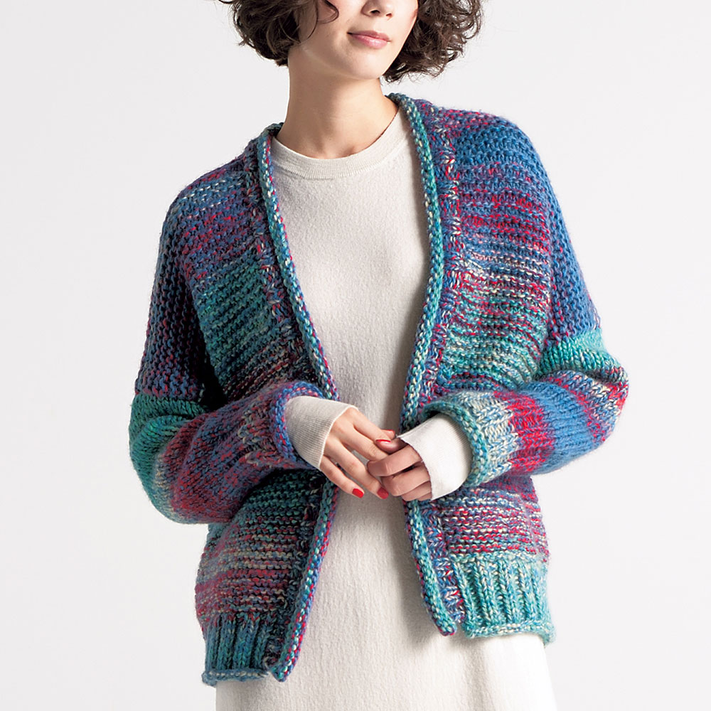 【キット作り方つき】気軽なアウターとしても着られる、ゆったりサイズの大人色カーディガン。並太のかすり染め糸2本どりでスムーズに編めるので、初級の方にもお勧めです