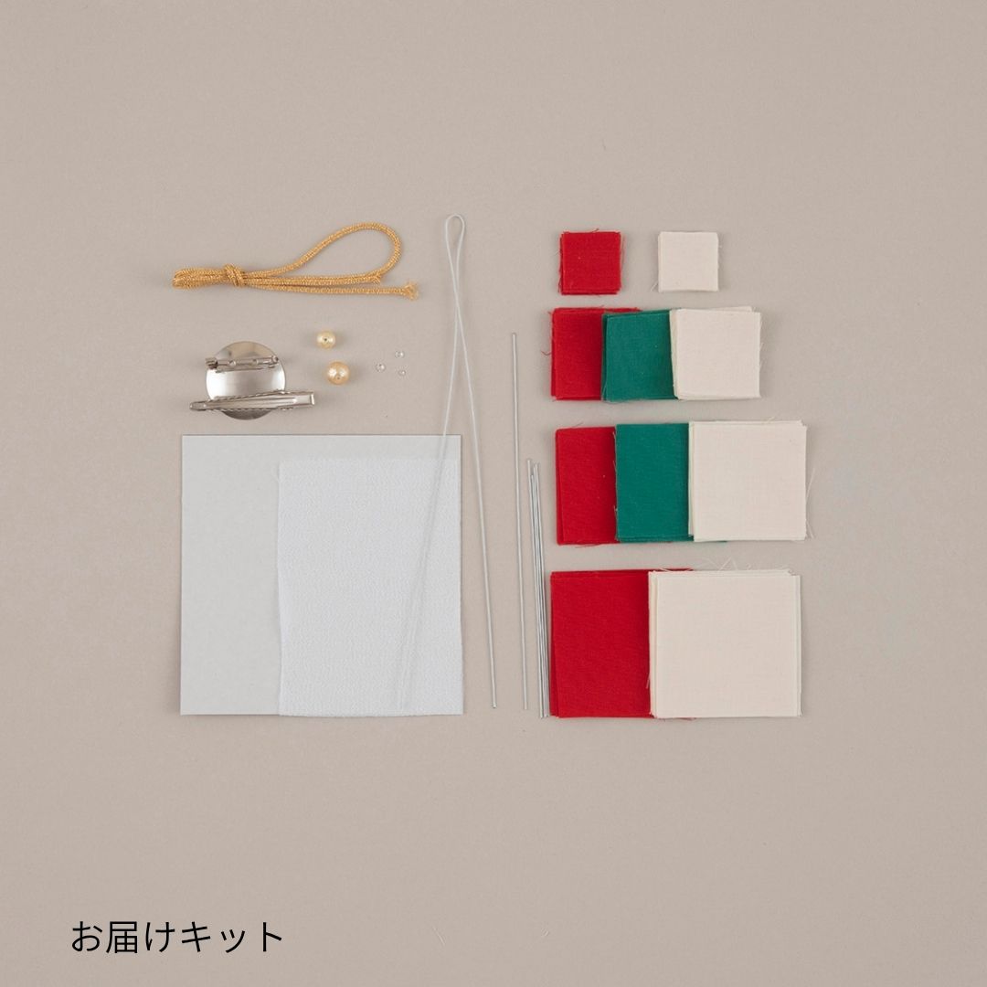 材料セット(コットン生地、ペップ、ビーズ、皿付きクリップ、厚紙、ちりめん、フローラルテープ)、作り方説明書