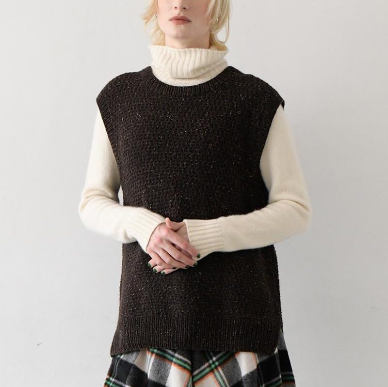 クルーネックのベストは誰にでも似合って、スタイリングも自由自在。ネップ入りの糸で編む、変わりかのこがシンプルな中にもニュアンスを添えて。200gあまりの軽さも嬉しい。薄手なのでジャケットの下にも着られます。