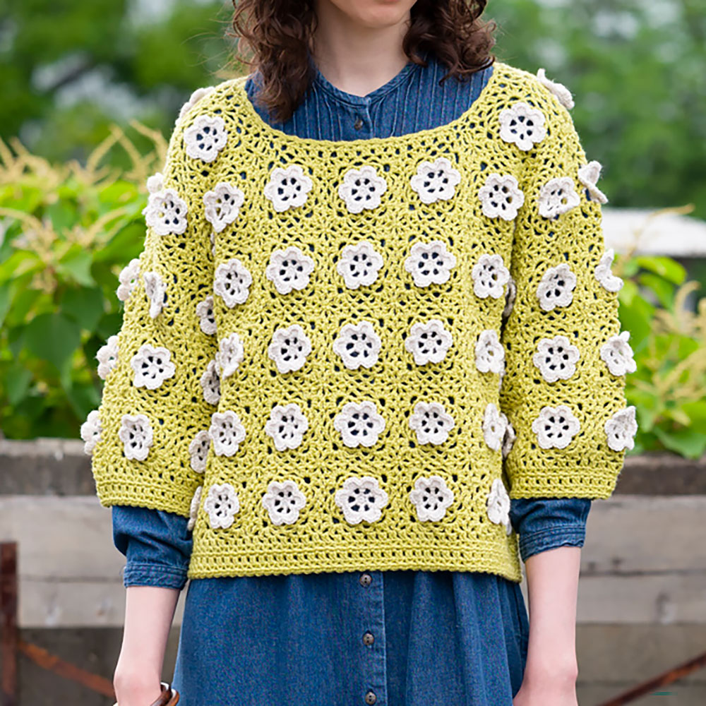 配色した立体モチーフが賑やかなお花畑プルオーバーは、ストンとかぶるだけでダークカラーを選びがちな季節の主役級アイテムに!シンプルなお洋服に花を添えるアクセントになります。単色で編むのも趣きが変わって素敵です。