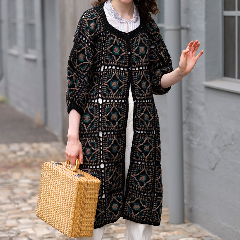 配色した引き上げ編みのダイヤのラインがアクセントになった、編み心をくすぐられるモチーフ。ピコットでつないだ空間がポイントです。大人カラーの配色のロングジャケットは、コートを着るまでにたくさん着たいアイテムです。
