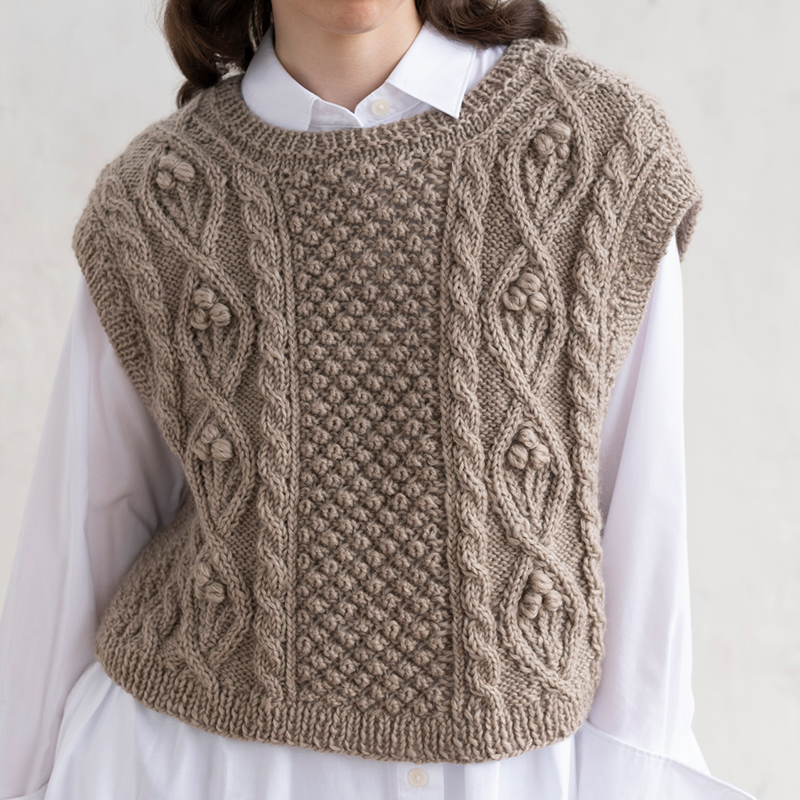 ダイヤモンドに花をあしらい、ベリーのような凹凸模様を合わせたフェミニンなアラン模様。ショート丈のベストは、この季節のおしゃれに外せないアクセサリーニット!アイコードのリボンで結んだバックスタイルもキュートです。