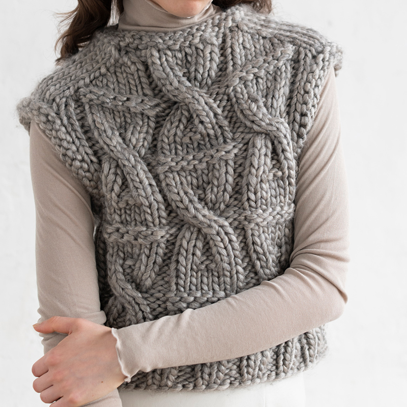 超極太のチャンキーヤーンは今秋も大人気の素材です。トップダウンでぐるりと編んで、衿、袖口を拾うだけのデザインは、軽くて暖か。目数も段数も驚くほど少ないので、ビッグケーブルのベストもまるで小物のように短時間で編み上がります。