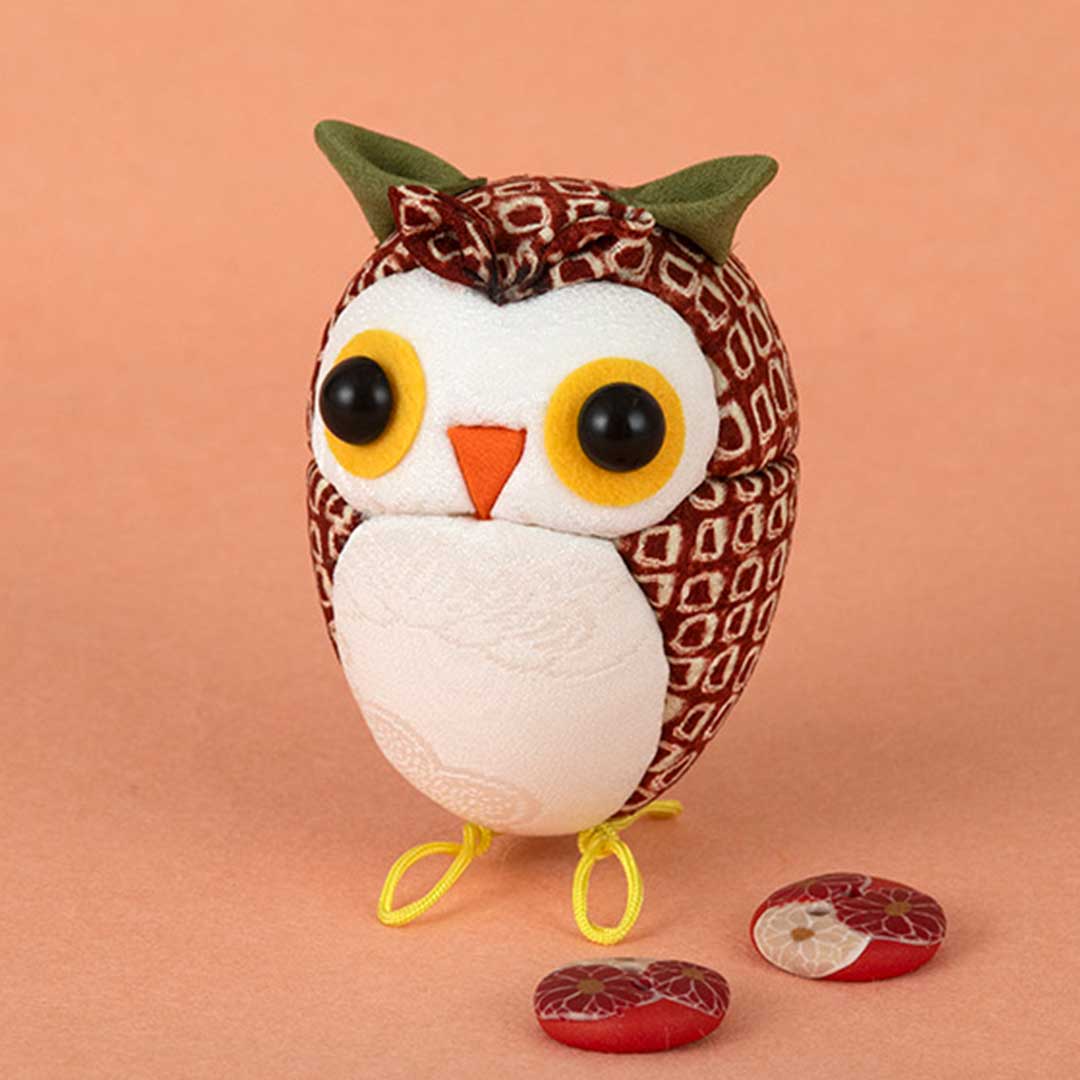 【古裂】【キット作り方つき】土台の溝に布を入れ込んでいく、木目込みの技法で作る可愛らしいフクロウです。足にワイヤーが入っているので、いろいろな場所に載せられます。