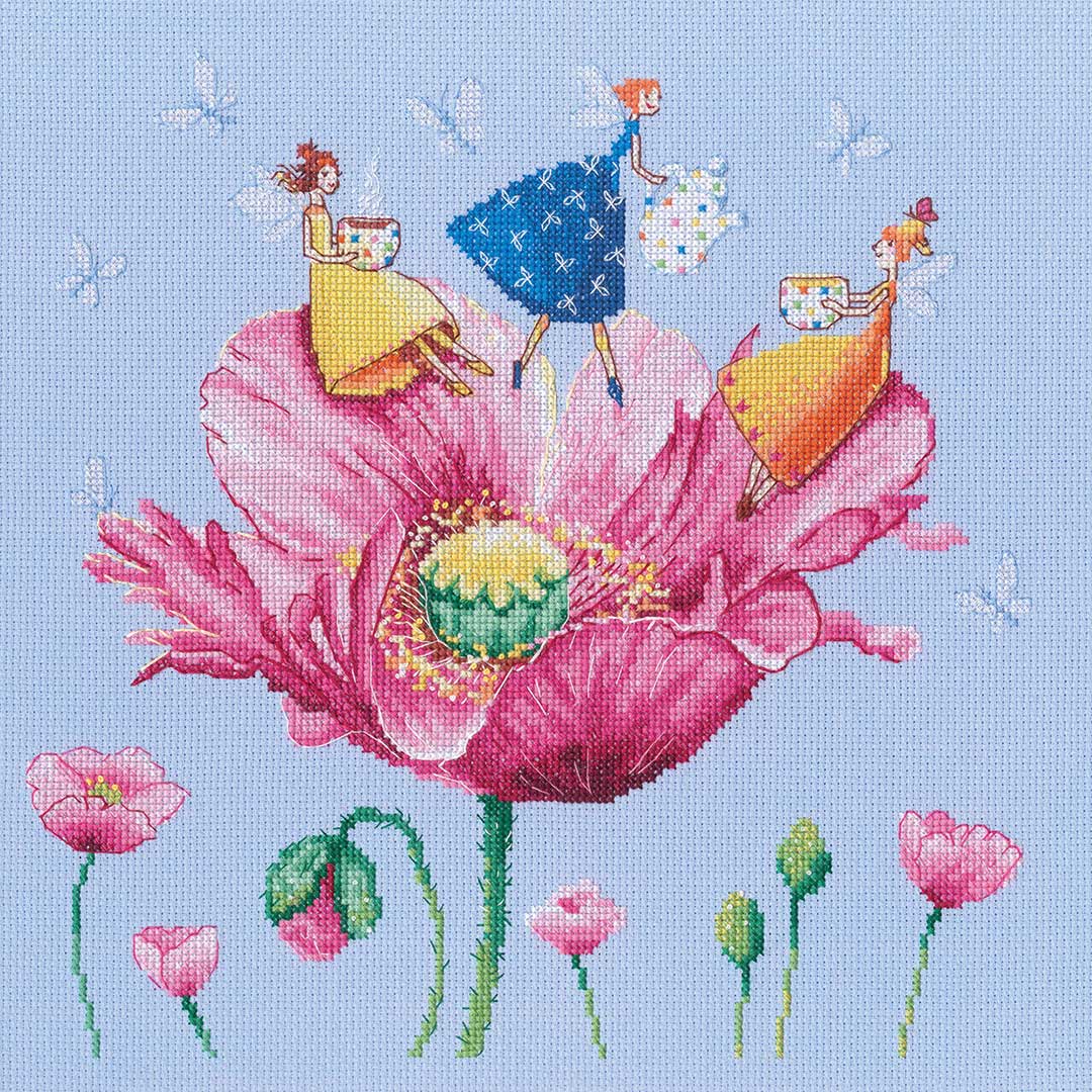 【キット作り方つき】まさか!花の上で妖精たちがティータイム。メルヘンチックなクロスステッチ作品です。上級の方向き。図案が大きくて見やすいエストニア・RTO社製。