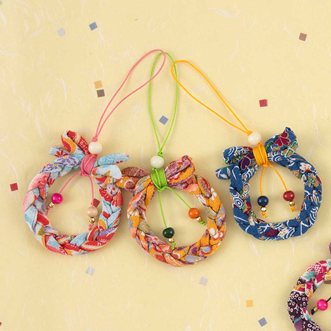 【キット作り方つき】ちりめんひもを三つ編みして京ひもで結ぶだけ。簡単に作れるストラップ3色セットを2種ご用 意しました。暗い場所で光る蓄光ビーズもひもに通します。お友だちへのお年賀にも。
