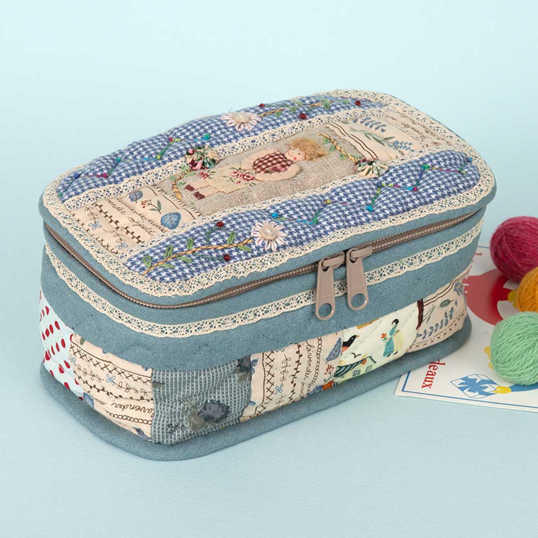 【キット作り方つき】化粧品や裁縫用具入れなどに活躍するバニティータイプの小物入れ。様々な布をピース ワークしたベースに、完成済みのドールのアップリケ布やレースなどを合わせます。