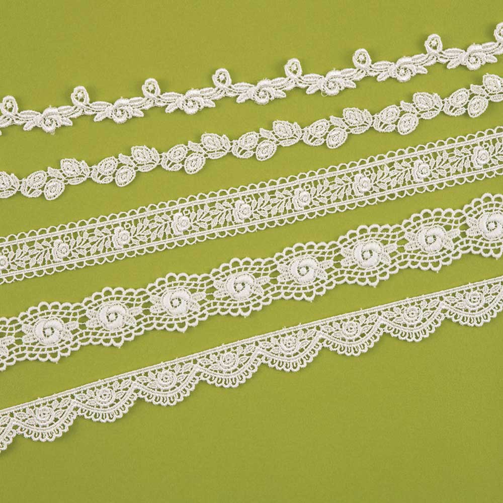 可愛らしいバラモチーフをつないだレーステープ5種類をセットにしました。作品をエレガントに仕上げてくれます。