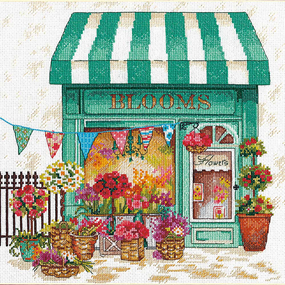 【キット作り方つき】爽やかなミントグリーンがおしゃれなフラワーショップ。色とりどりの花やトピアリーを店先に並べた、華やかなクロスステッチ作品です。上級の方へ。アメリカ・Dimensions社製