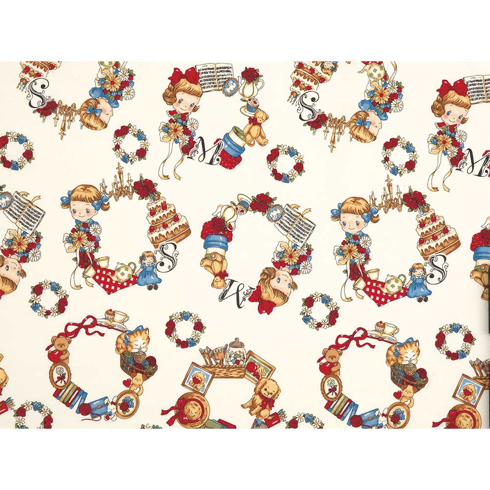 マーガレット&ソフィーシリーズ。花やティーアイテム、毛糸にペペとポポなど、ふたりの大好きなもので作ったリースを描きました。リースの直径は約8cm。