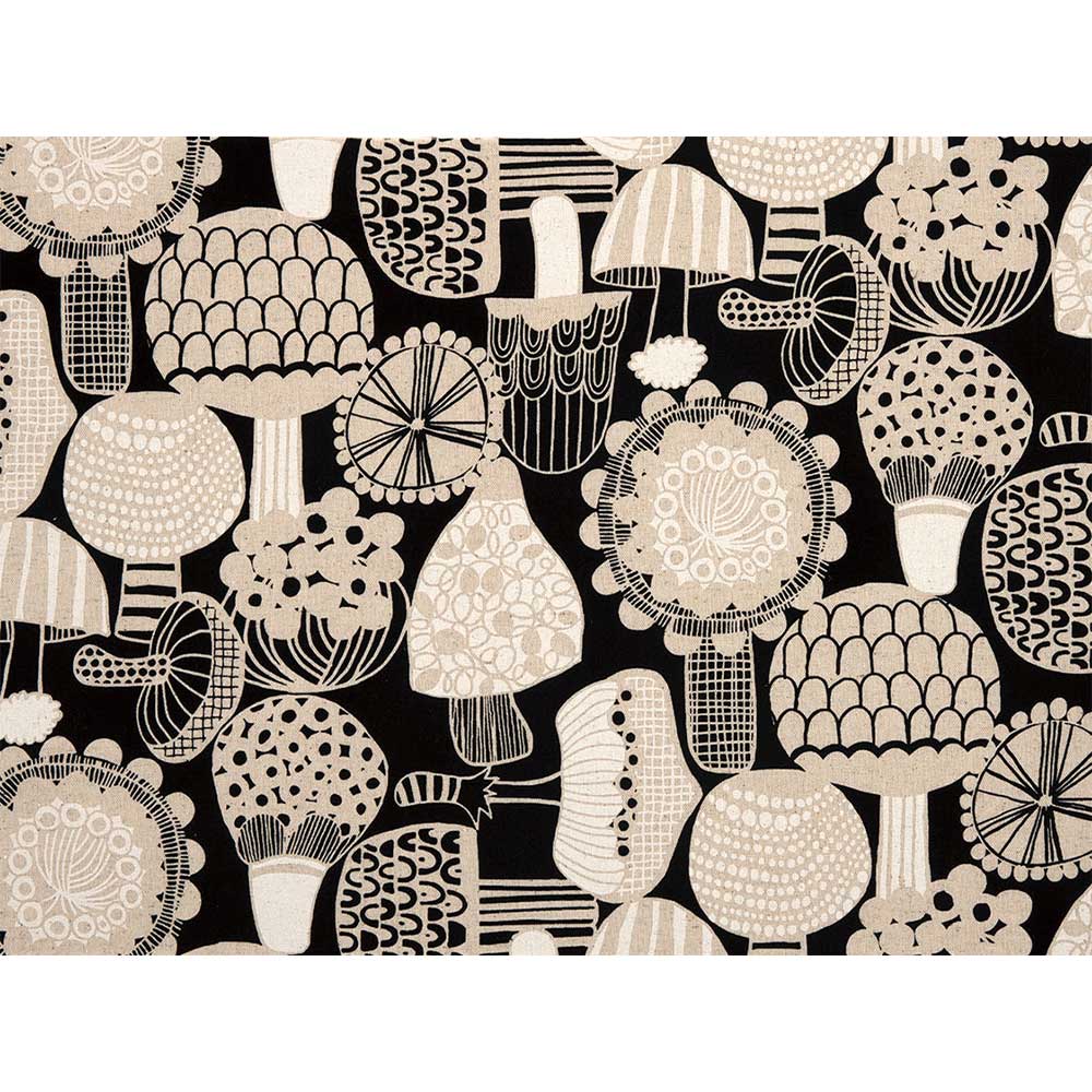 [綿麻キャンバス]綿殻入りのナチュラルな綿麻地に、キノコをアーティスティックに描いた北欧風のプリント。やや厚手のキャンバス地なのでバッグなどにおすすめです。