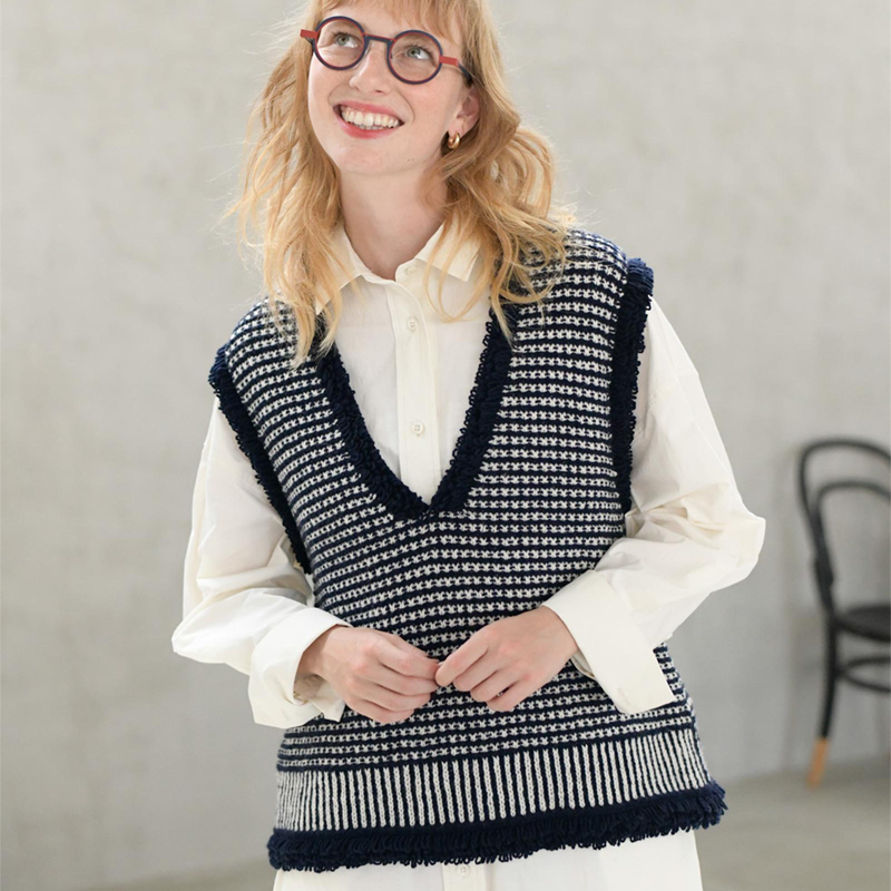 深めのVネックがおしゃれなベストは、身頃は棒針編み、縁まわりのフリンジはかぎ針編みのハイブリッドスタイル。メリハリの効いたすべり目の編み込み模様とたっぷりとあしらわれたループの組み合わせが新鮮なデザインです。