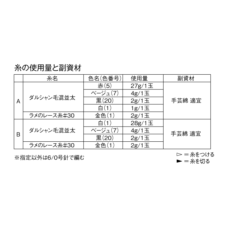 材料:DARUMA ダルシャン毛混並太、ラメの レース糸#30。糸の色名・色番号・使用 量は図中の表を参照してください。