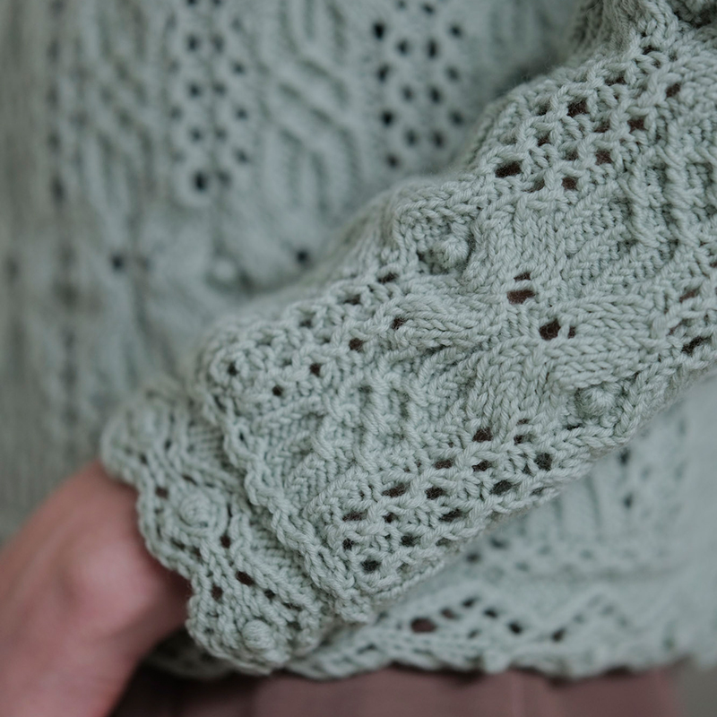 全体の模様構成は、交互に並んだ模様を縦に半分ずらして、横の模様に変えました。模様の詳細は毎段の寄せ目レース、2目のジグザグレース、ねじり目と裏目ラインに糸巻きノットの花、この3種を組み合わせています。縁編みは、ダイヤ模様をそのまま端に活かせる模様を選びました。身頃についているボップルを組み合わせて、とじる側に裏目を配しています。衿は細く仕上げたかったので、ダイヤ模様のみとし、裾と袖口は身頃と同じ2目のジグザグレースを1本加えました。編み上がったら、ダイヤの形に沿ってピンを打ち、アイロンでしっかり形を整えて仕上げます。