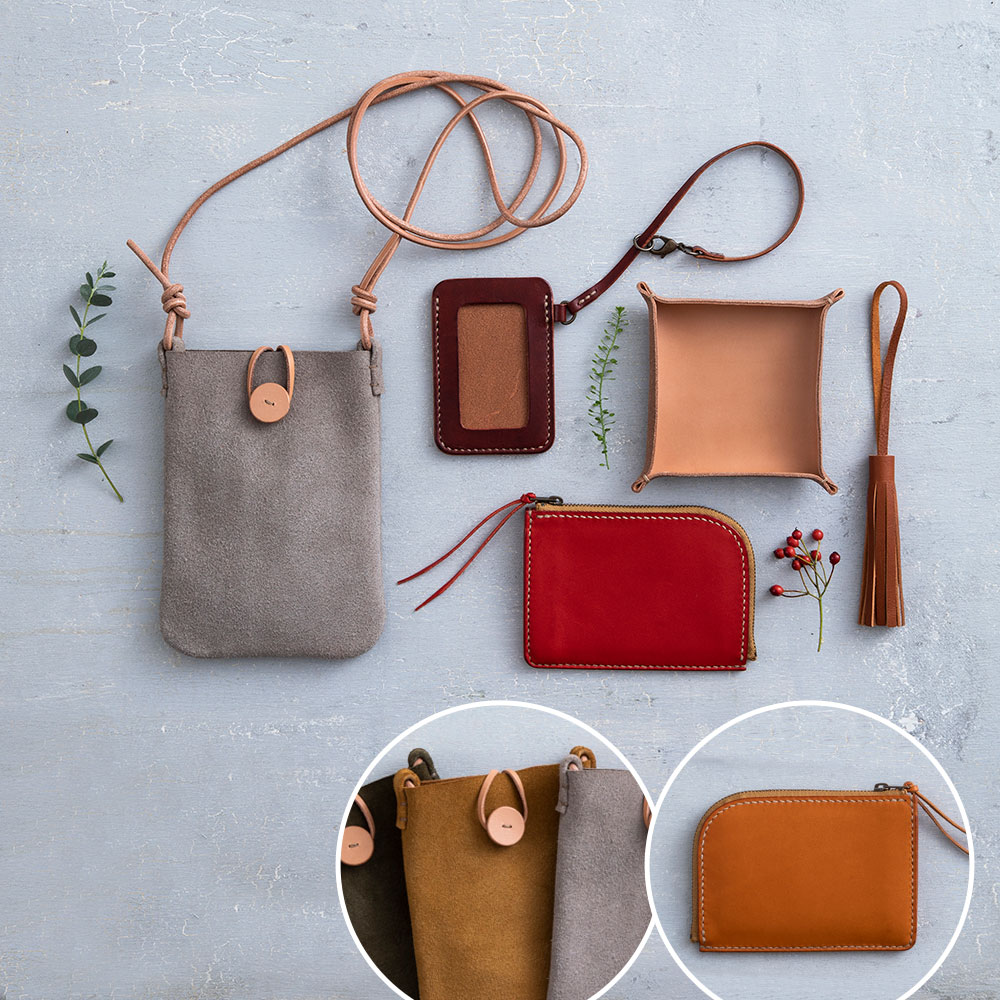 カリキュラム自体が、作品を順を追って作っていくと少しずつ技術や知識が身に付いていくように開発されているので、楽しく作っているだけでレザークラフトが上達します。しかもどれも使いたくなる作品ばかり。一部の作品の革の色や、糸色も16色から選んでお好みで仕立てられるので、作った後も一層愛着が沸きます。