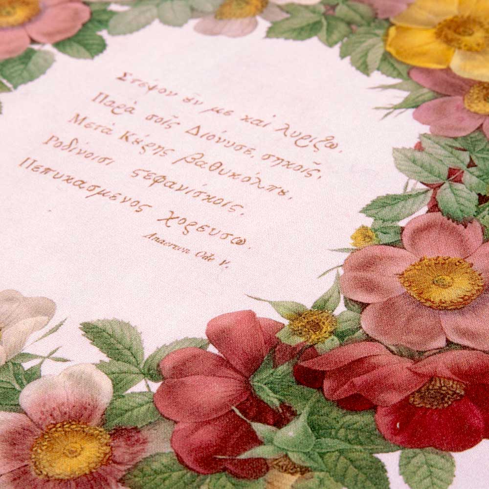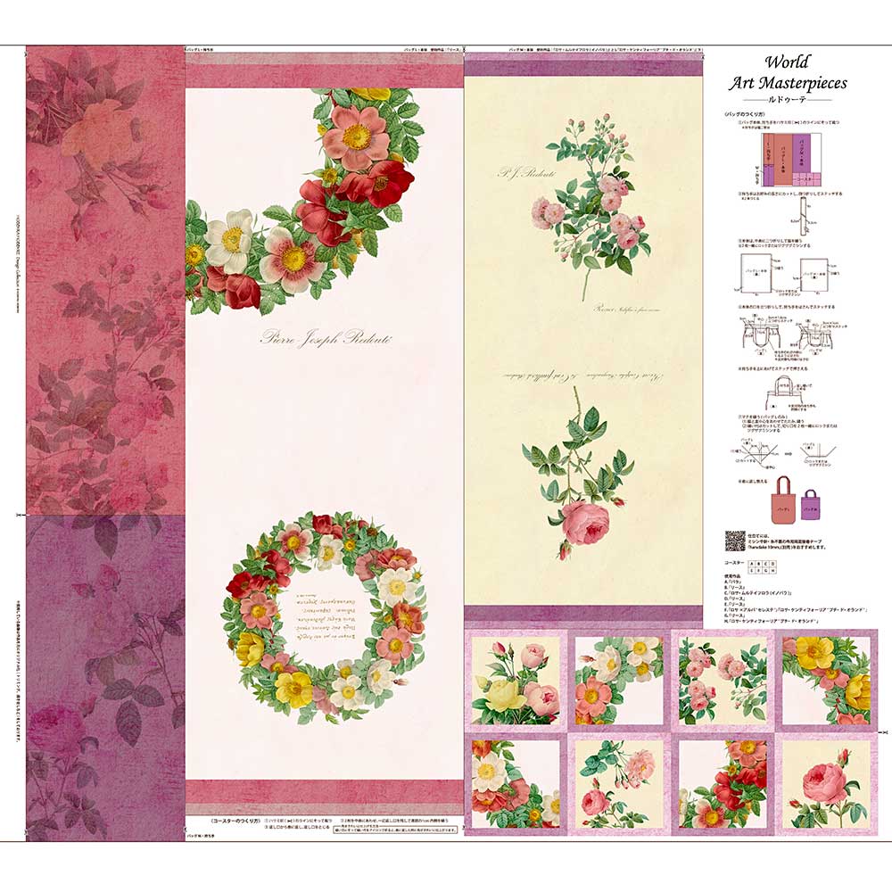 ルドゥーテのバラの作品を使用したシーチングのパネル生地です。バッグ2種と、コースター4枚がつくれます。 使用作品:バッグL、コースター「リース」/バッグM、コースター「ロサ・ムルテイフロラ(イノバラ)」「ロサ・ケンティフォーリア(プチ・ド・オランド)」/コースター「バラ」「ロサ×アルバ(セレステ)」