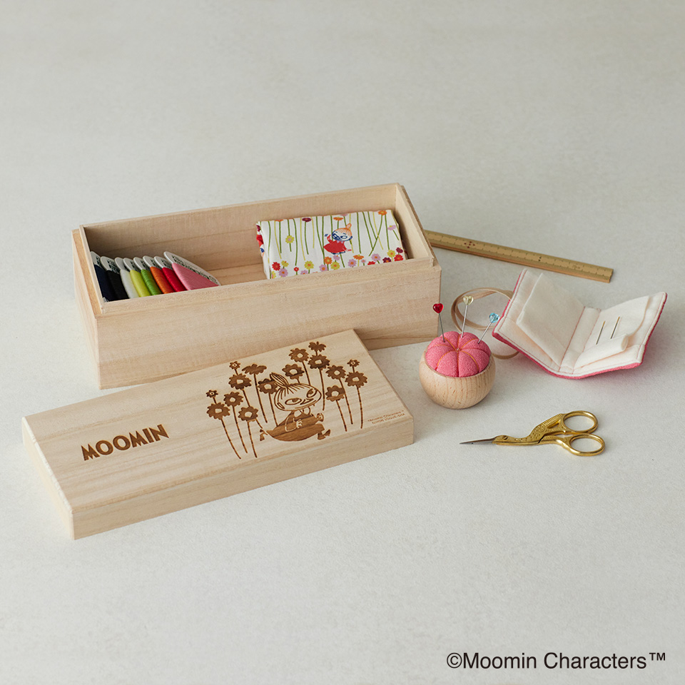 桐箱、針山、ニードルブック、まち針(3本)、本縫い針(2本)、ボタン付け糸(8色/ピンク・赤・オレンジ・黄緑・レモン・白・黒・紺)、20cm竹尺、糸切りはさみ、リトルミイ柄布(約 幅50×送り50cm)