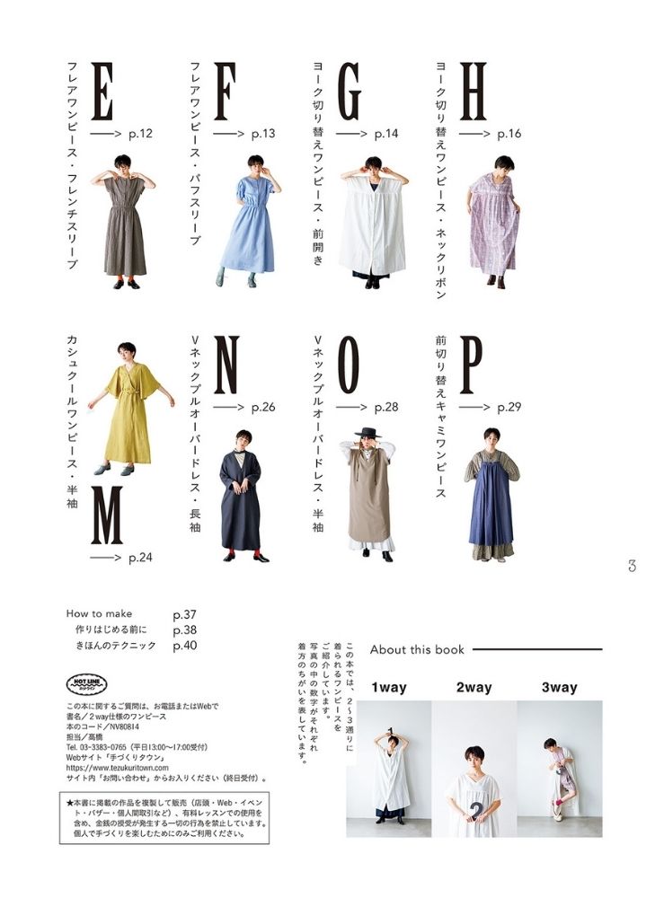 せっかく心を込めて作る洋服は、何度でも楽しめるお気に入りにしたい。この本では、1着で2通りに着られるワンピースを集めました。前後でネックラインが違ったり、ウエストひもでシルエットを変えたり、前を開けて羽織にしたりと、着方のアレンジは自由自在。シンプルベーシックを中心に、カジュアルからよそゆきまで、日常のいろいろなシーンで選びたい20作品を掲載しています。1着でもコーディネートが完成し、重ね着や小物合わせでさらにおしゃれの幅が広がります。一部3wayアイテムも掲載。フリーサイズ、縫い代込みの実物大型紙つき。
