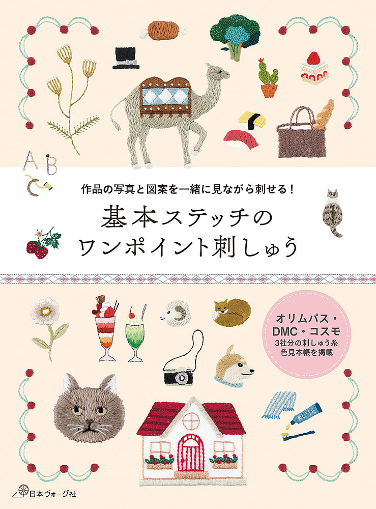 アウトラインステッチ、チェーンステッチ、サテンステッチなど基本のステッチ11種で刺せるかわいいワンポイント図案の本。