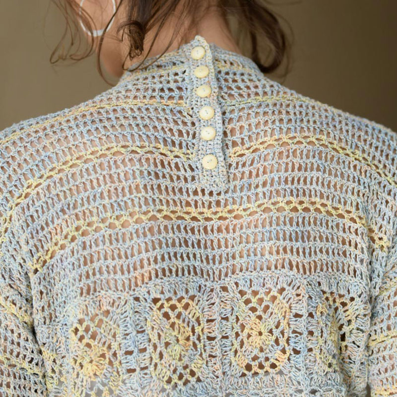 穏やかに色が変化する段染め糸を2色使ってシンプルなモチーフを編んでつなぎ、別に編んだヨーク部分と巻きかがって仕上げます。衿ぐりは後ろあきにしてボタン留めに。ハイネックなので、衿元のあいた服が苦手な方に特におすすめ。