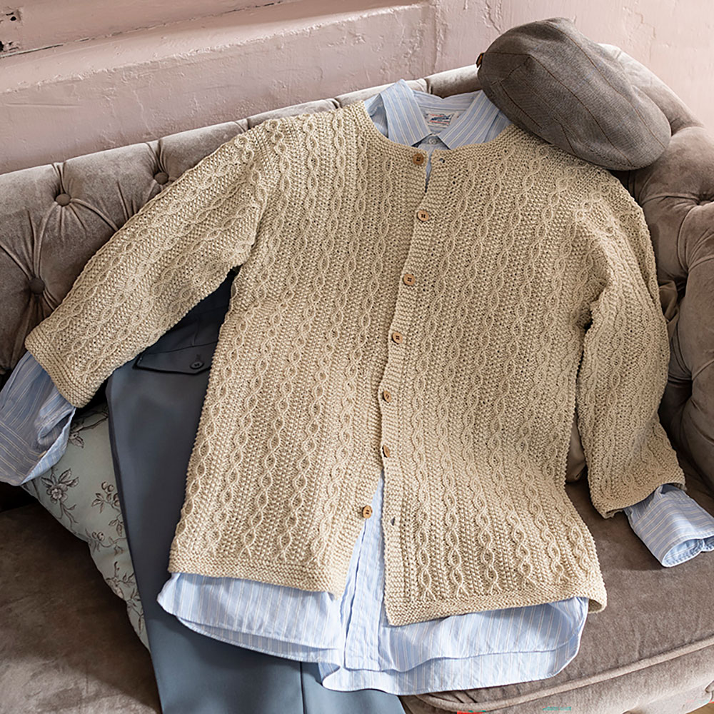 ※毛糸だま掲載時よりちょっぴり詳しい記号図付き ケーブル模様が印象的なカーディガン。身頃は前後続けて前立ても一緒に編み、袖はまっすぐに編んだ袖ぐりから拾って輪に編んでいます。(このレシピはメンズのみです。)