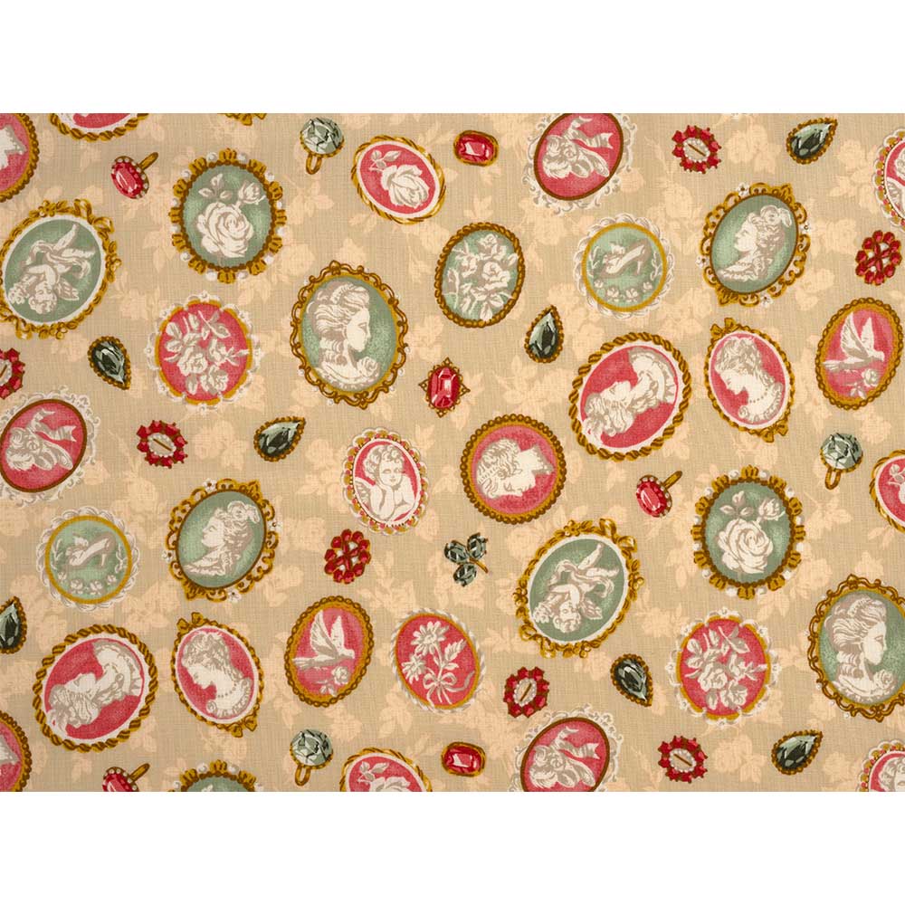 美しいカメオのブローチや宝石を描いた華やかなデザインのプリント。ポーチやモチーフを切り取って使っても。