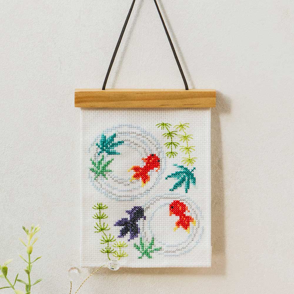 【キット作り方つき】【フレームつき】ラメ糸がキラキラと上品に輝く刺しゅう布に、金魚や青紅葉をクロスステッチする涼し気なデザインです。フレームつきなので、作ってすぐに飾ることができます。初~中級の方向き。部分的にシルバーのラメ糸も使うので、キラキラ感がプラスされます。