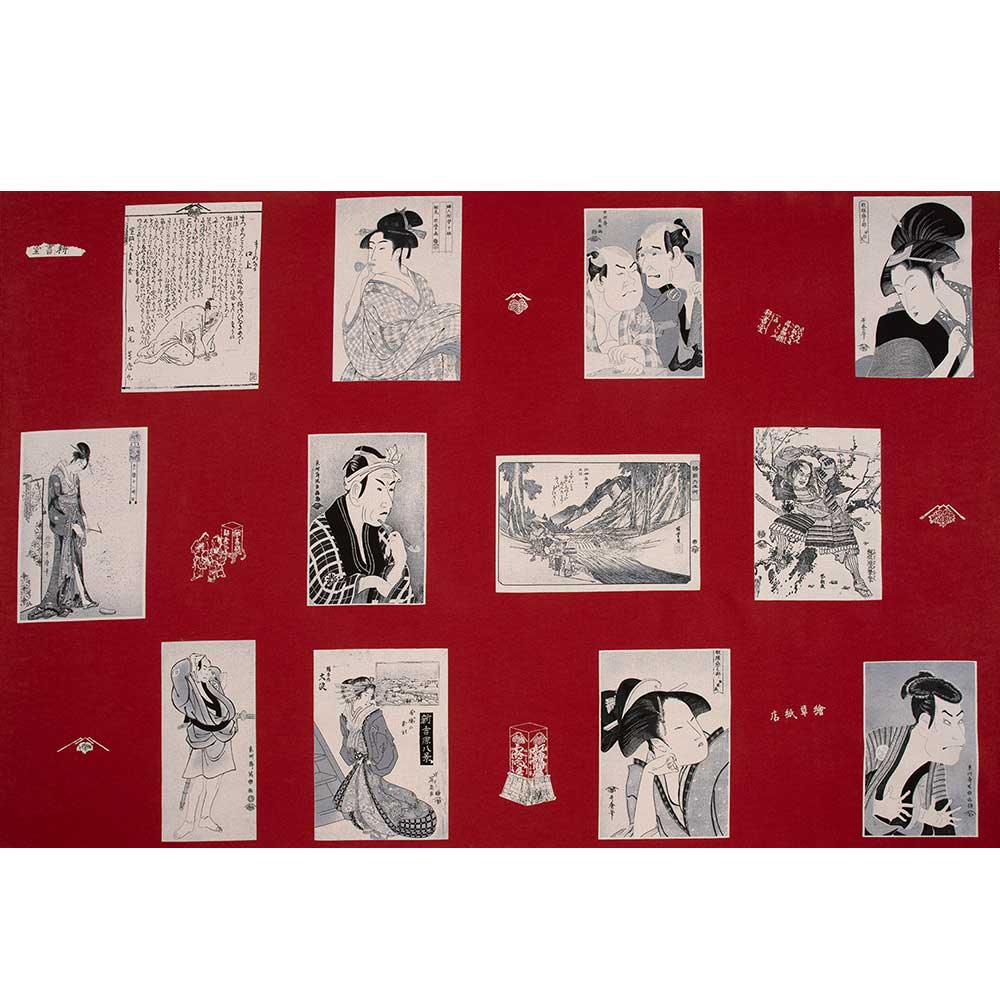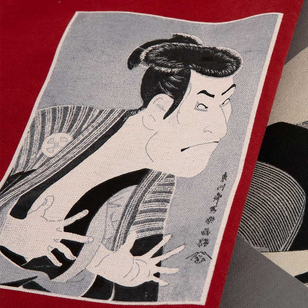 江戸のメディア王として当時有名だった蔦屋重三郎。蔦屋重三郎は浮世絵や洒落本、黄表紙本といった娯楽の本を中心に出版していました。江戸時代の版元蔦屋重三郎の出版作から選び、パネル布にしました。写楽約19×13cm。柄が大きめなので作品例のような大きなバッグを作ったり、タペストリーなどにしても。浮世絵では、喜多川歌麿(きたがわうたまろ)や東洲228斎写楽(とうしゅうさいしゃらく)といった有名な絵師の本も出版していて、彼らを一躍有名にしたのは蔦屋重三郎だと言われています。2025年NHK大河ドラマ「べらぼう~蔦重栄華乃夢噺~」です。