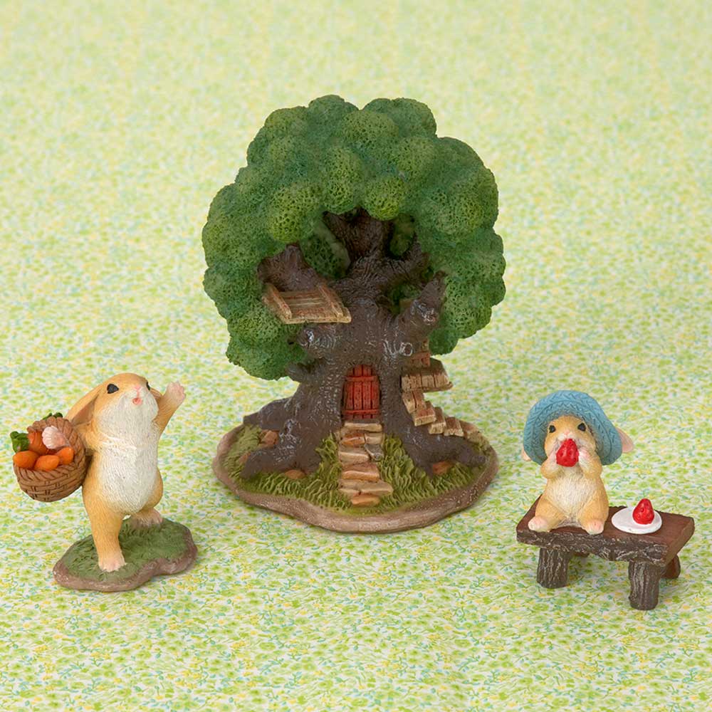 ツリーハウス=幅8.5×奥行8.0×高さ10.8、キャロットバスケットラビット=幅5.1×奥行3.6×高さ5.7、おやつイチゴラビット=幅3.3×奥行2.7×高さ5.7cm