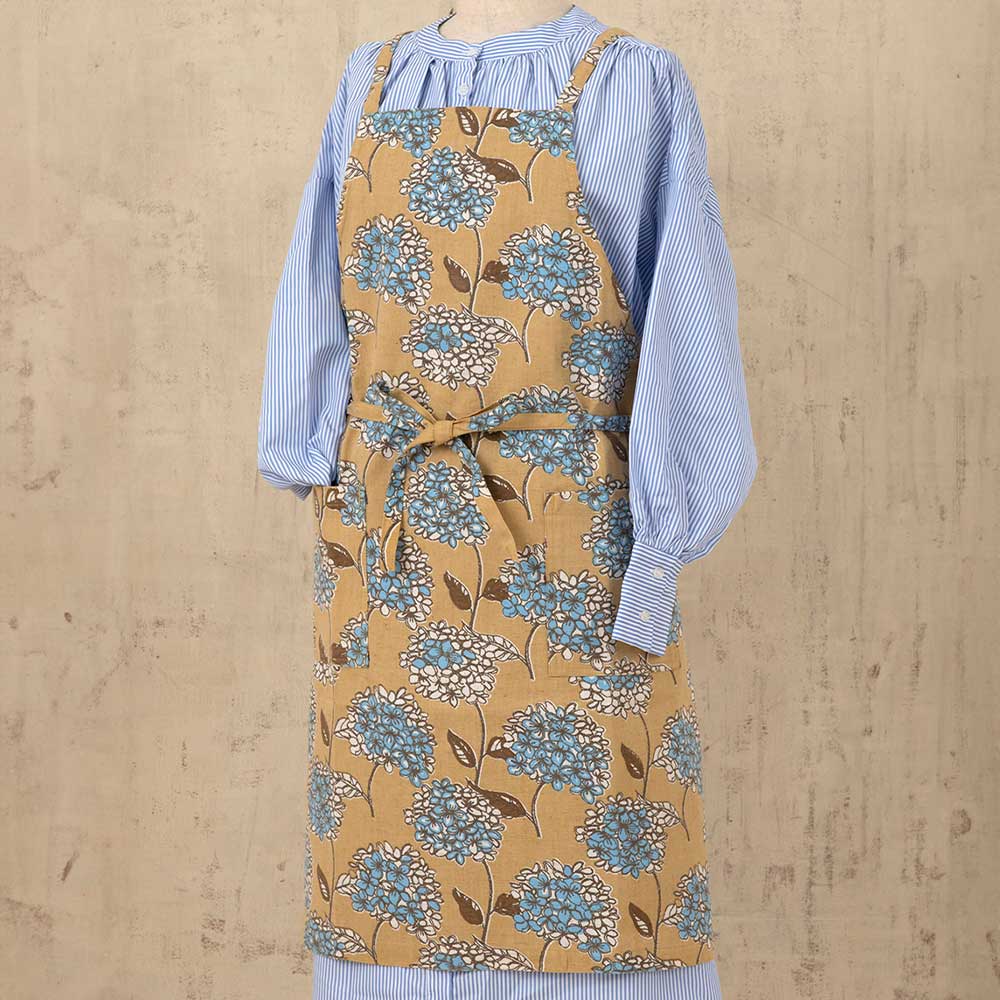【完成品】麻混生地で使いやすいと人気のシリーズより、春夏にぴったりの爽やかなあじさい柄のエプロンです。ナチュラルなベースカラーに少し大きめの紫陽花が描かれた大人っぽい柄。ひもは後ろでゆったりと結んでも、前に回してもOK。オーソドックスな使いやすい人気の形です。足さばきの良い短めの丈です。