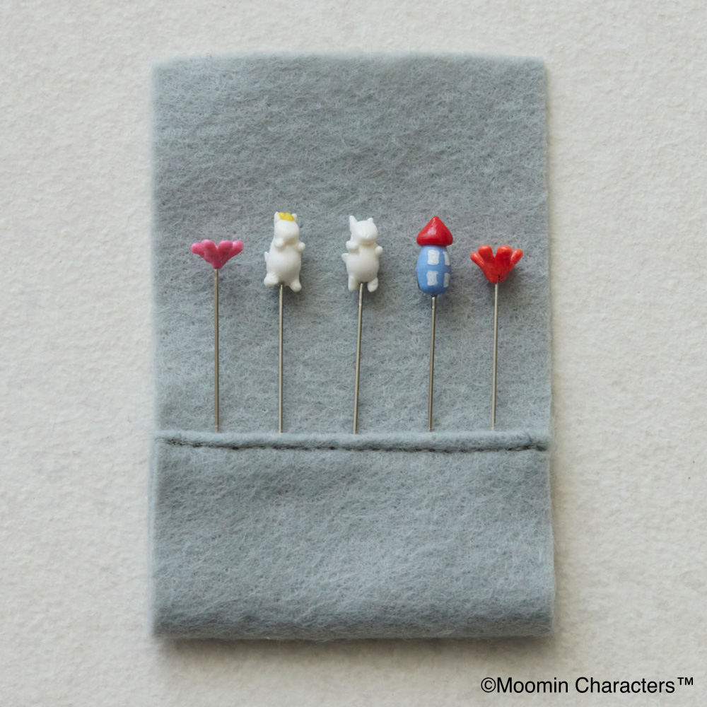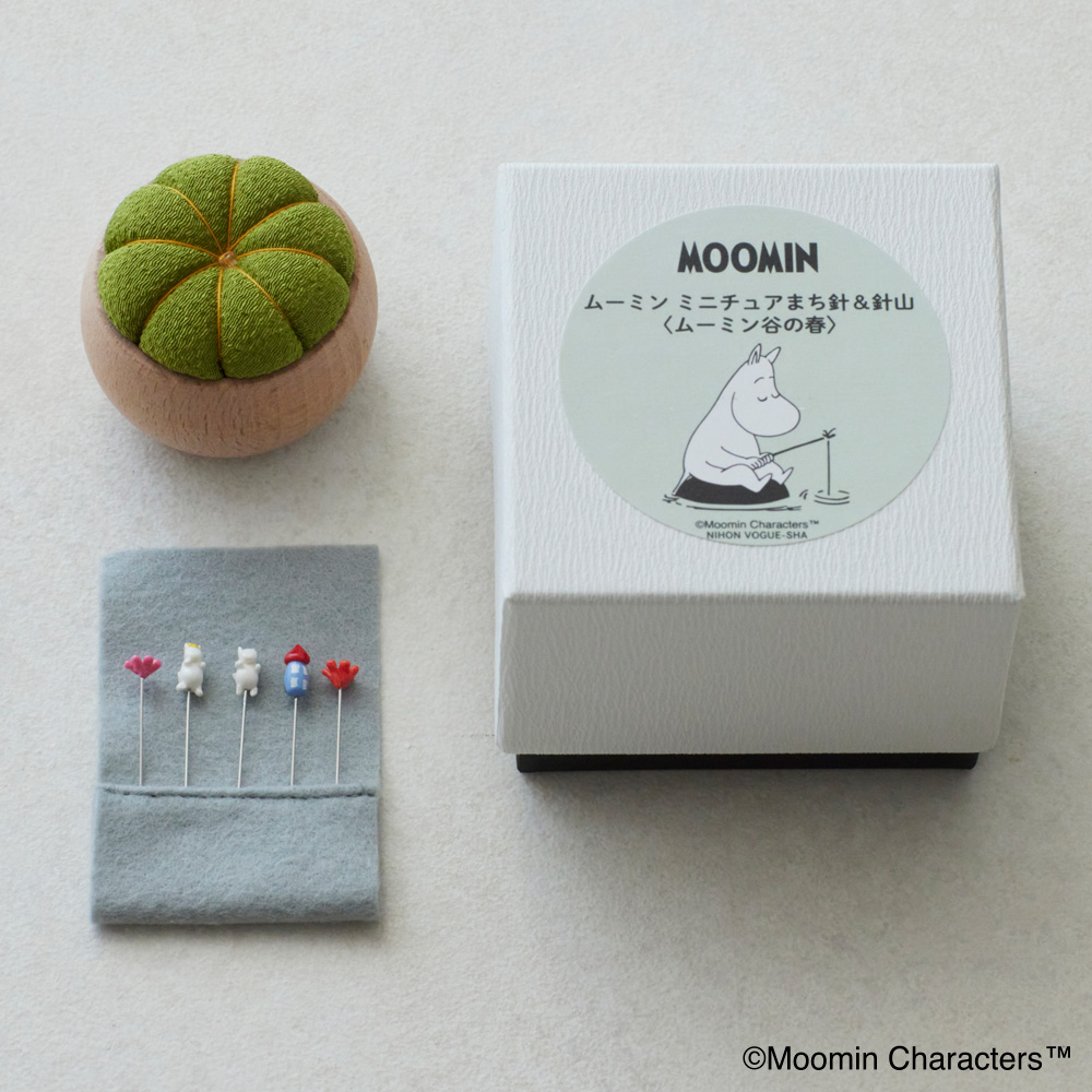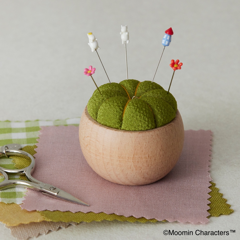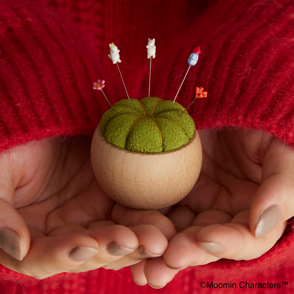 ムーミン谷ののどかな風景を、手のひらサイズのまち針と針山で表現しました。まち針は熟練した職人さんが一本ずつ樹脂で丁寧に手づくり。ヘッドの小さなキャラクターたちは驚くほど精巧に形づくられています。ちりめんの生地に温かみのある木の器を合わせた針山は、ナチュラルで「和」の雰囲気があり、日本の伝統とムーミンの世界の調和をお楽しみいただけます。