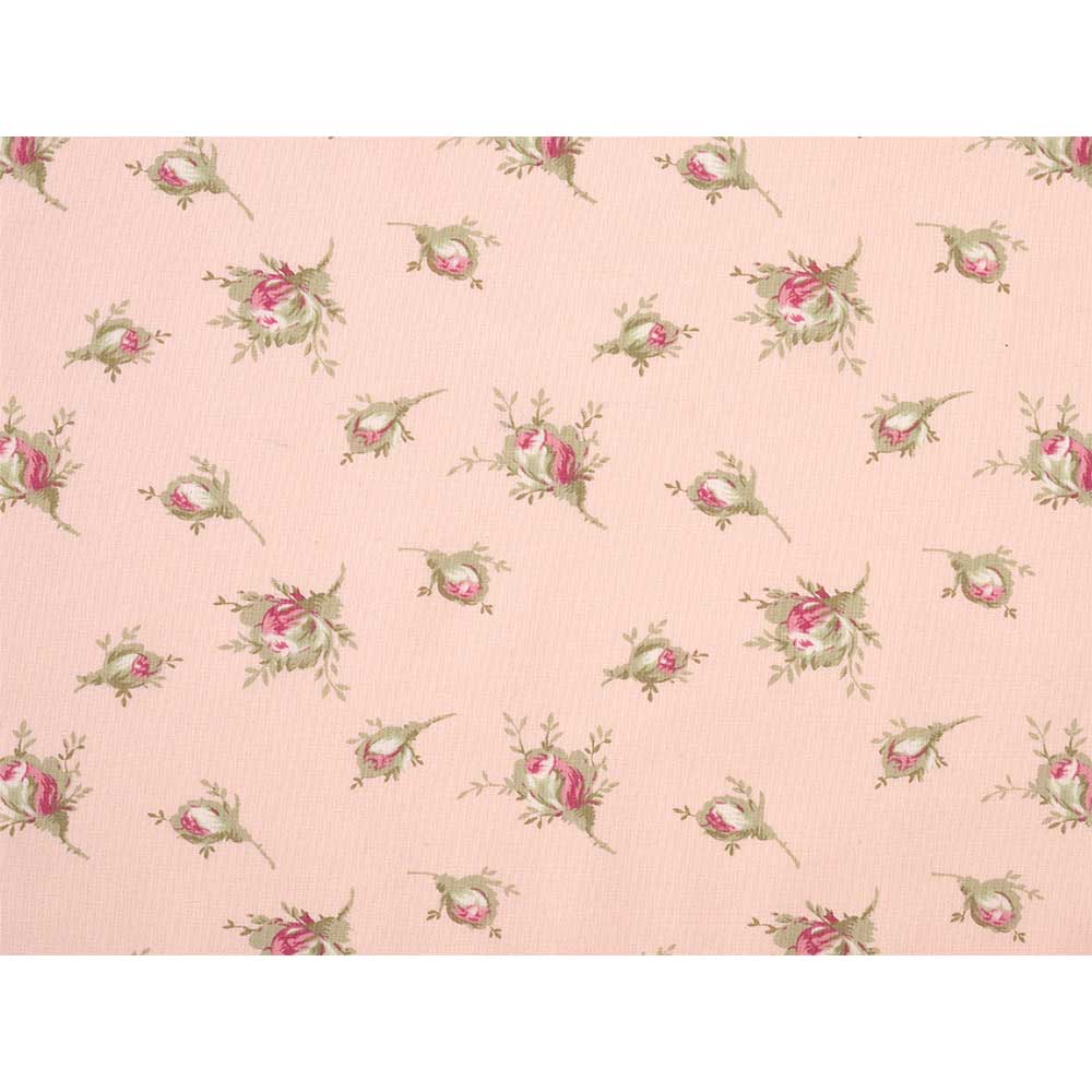 サーモンピンク地に可憐なバラのつぼみを描いた優しい印象のプリントです。ピースワークや裏布などにも。