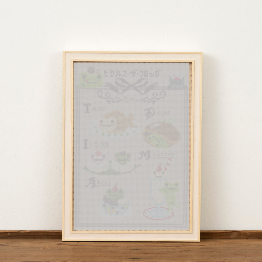 作品を飾るためのフレームです。どんな作品にもやさしくマッチします。 商品番号:CF9976Y03 【使用している商品】 CF916003 かえるのピクルスクロスステッチキット レトロカフェ OA-B5サイズ 額裏内寸25.7×18.2cm 縁幅:1.5cm 素材:木製 ガラス板、裏板、吊り日もつき