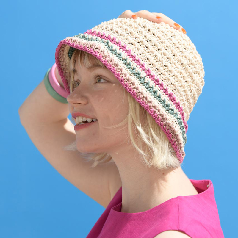 ナチュラルカラーに差し色を効かせた、夏の陽射しに映えるシンプルだけど可愛いバケットハット。長編みの引き上げ編みを交差させた、ベース模様が印象的な編み地です。