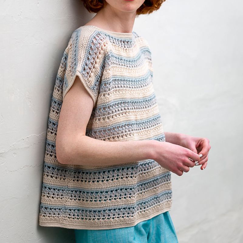【編み方解説付き】模様編みを組み合わせたプルオーバー。厚みのあるイメージのアフガン編みですが、こんなに透け感のある模様も編むことができます。衿ぐりや肩下がりに減目がありますが、減目部分はプレーンなのでぜひチャレンジしてみて。