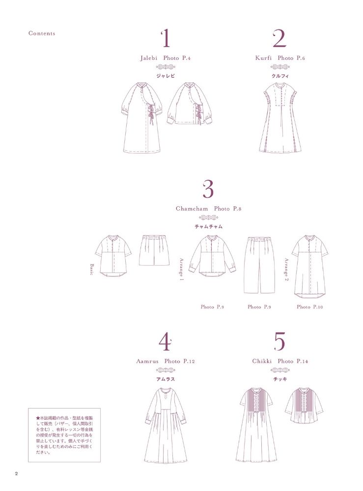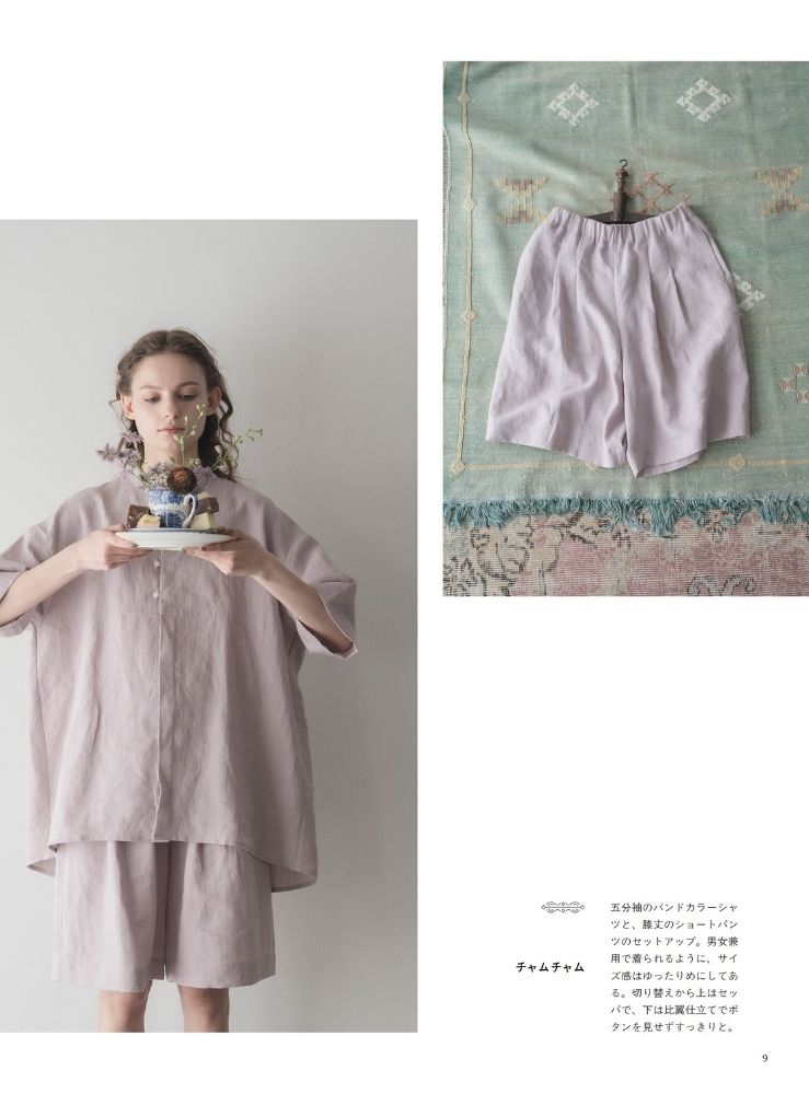 ディティールにこだわりのある12の形を提案。ワンピース、ブラウス、セットアップ、オールインワンなどバラエティに富んだラインナップの服はどれも作りがいがあり、すっと背筋が伸びるような美しい仕上がりです。1(S~M相当)、2(L~LL相当)の2サイズ展開。縫い代込みの実物大型紙つき。