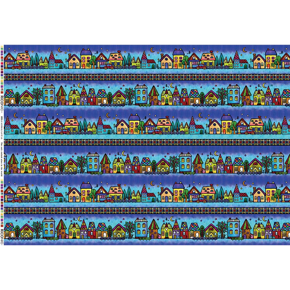 [デジタルプリント]2023年初秋号で人気があったデザインを、少し縮小して使いやすくしました。色鮮やかなステンドグラスのハウスモチーフを、インクジェットプリントでリアルに表現。1リピートにハウスのボーダーが4列入ります。ハウスの高さは約5~8cm。