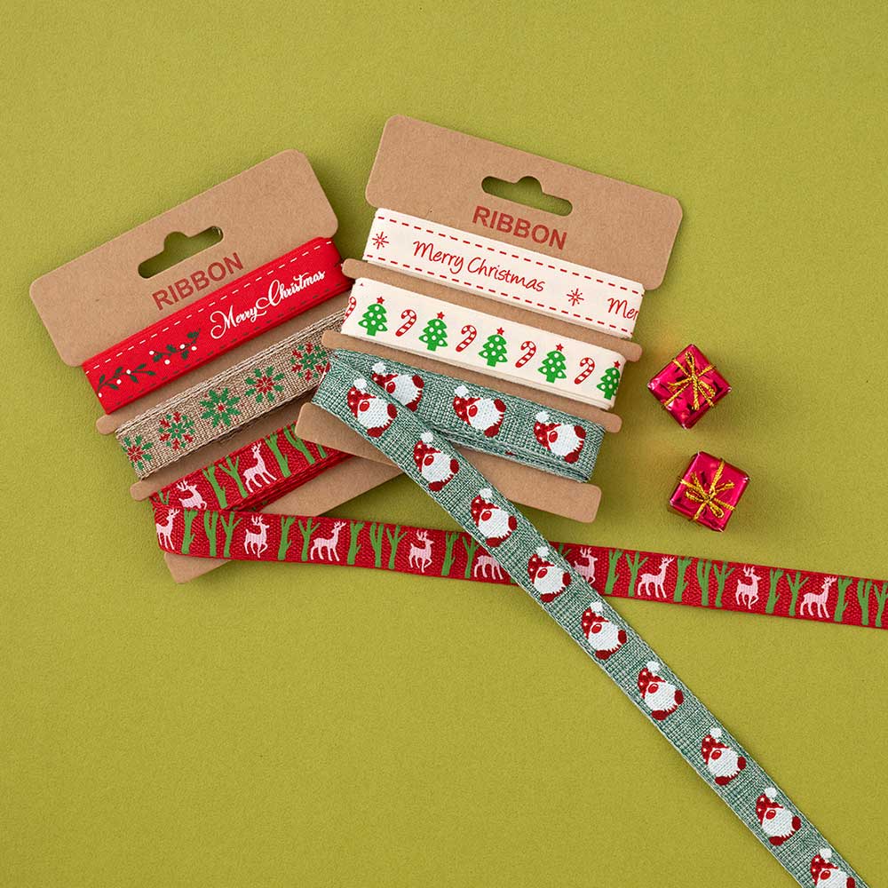 作品のデコレーションやギフトラッピングなどにおすすめの、クリスマスモチーフをプリントしたリボンテープのセットです。