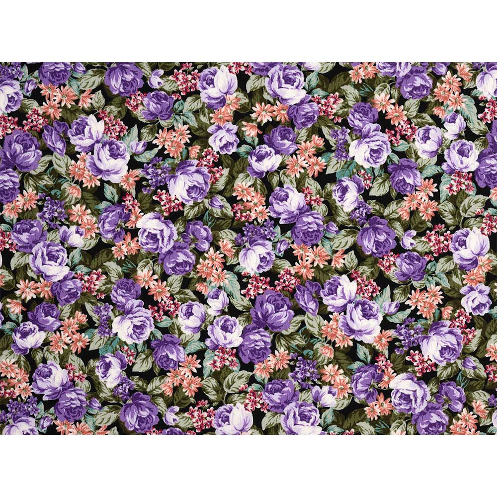 黒地に紫のバラを敷き詰めた華やかでエレガントなプリントです。小物やバッグなどにも。