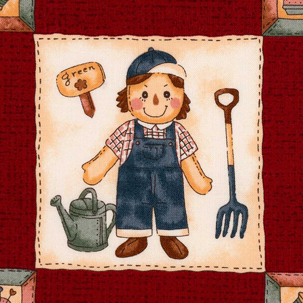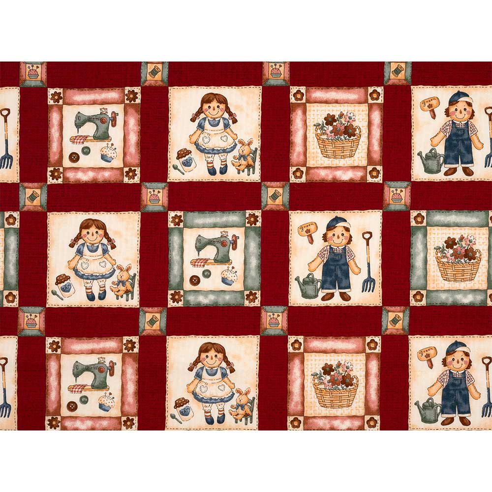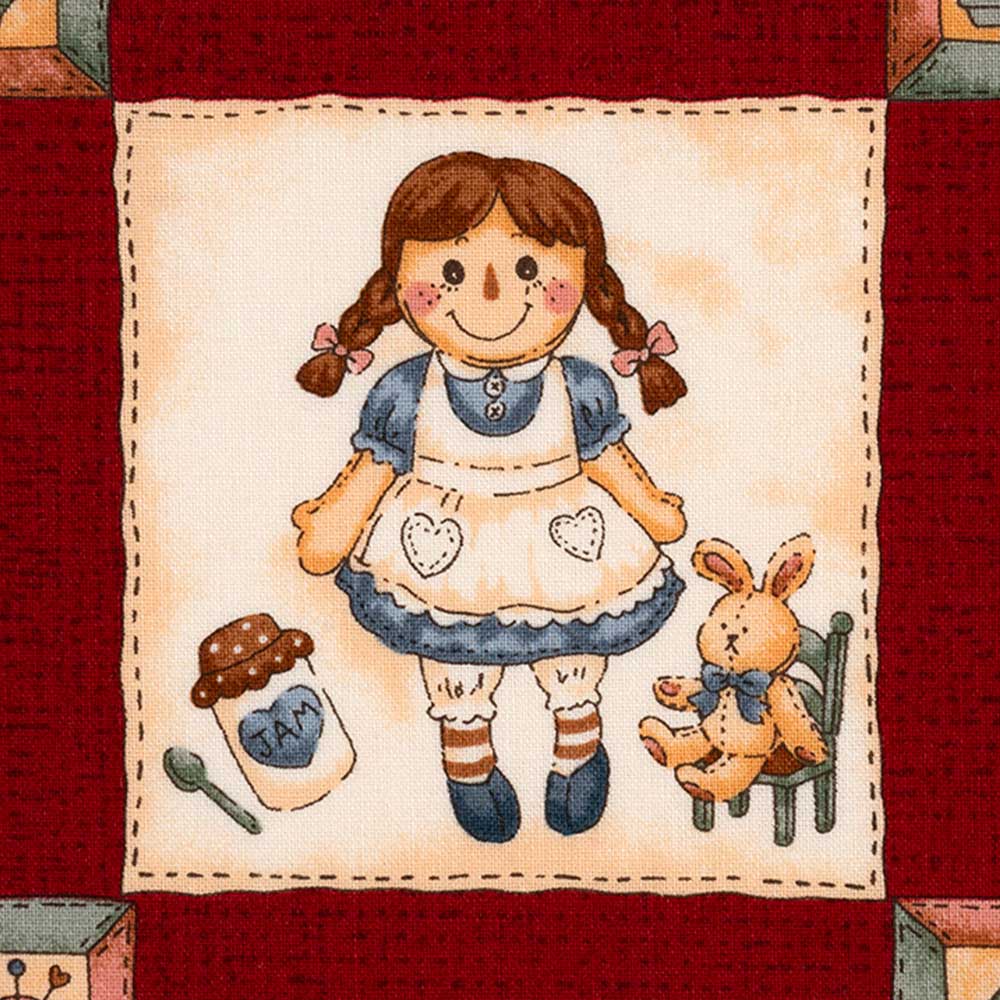 約7.5cm角のブロックに、カントリードールのジョンとエミリーやバスケットやミシンなどを描いた、カントリーテイストの可愛らしいプリントです。モチーフを切り取って使っても。