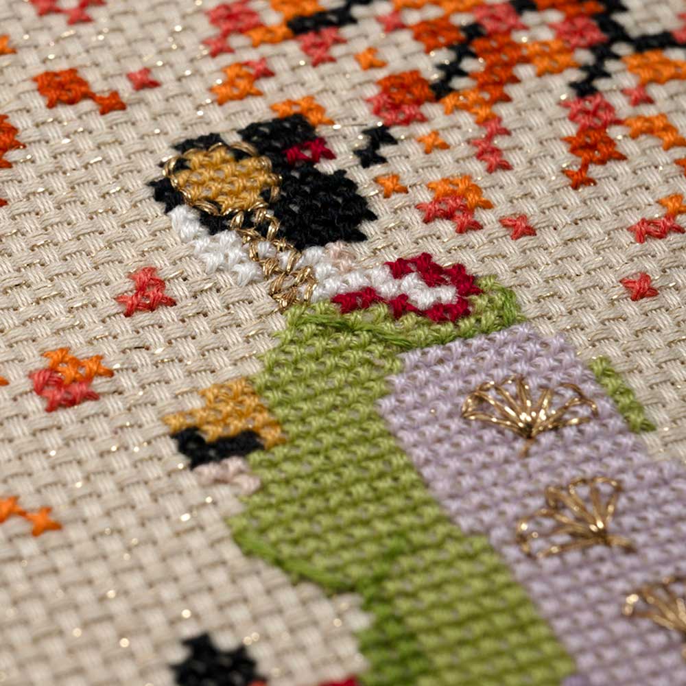 【キット作り方つき】【フレームつき】ラメ糸がキラキラと上品に輝く刺しゅう布に、橋の上の舞妓をクロスステッチする風情あるデザインです。フレームつきなので、作ってすぐに飾ることができます。初~中級の方向き。部分的にゴールドのラメ糸も使うので、キラキラ感がプラスされます。