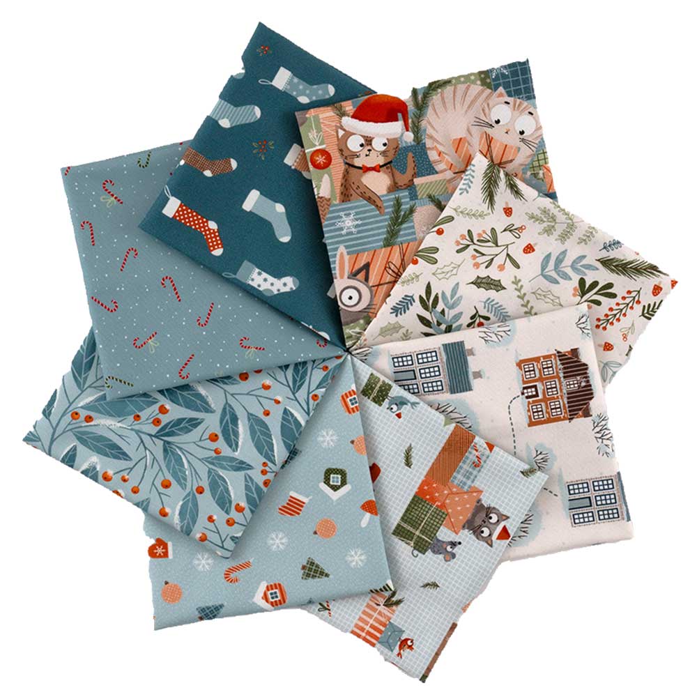 【USA】 キュートな猫たちと、クリスマスモチーフをスモーキーなブルートーンで描いた、シックでユニークなカットクロスセットです。