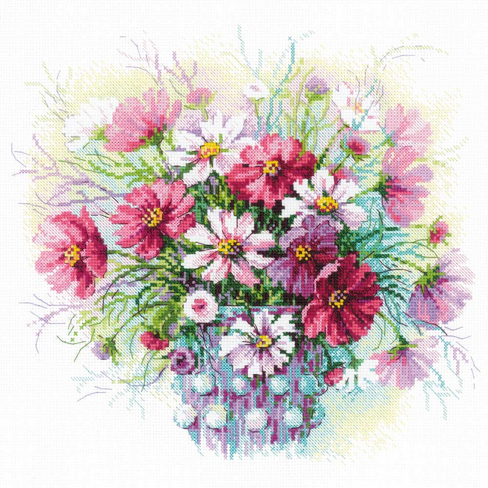 【キット作り方つき】赤とピンクの可憐なコスモスをを水彩画風に描いたクロスステッチ作品。上級の方向け。リトアニア・RIOLIS社製。