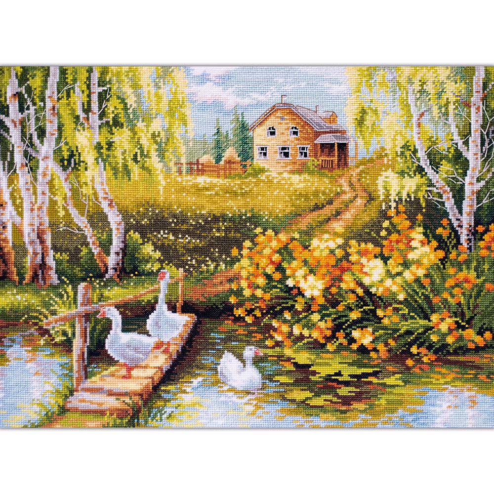 【キット作り方つき】池で水浴びをするガチョウや木々、ファームハウスを描いた、のどかなクロスステッチ作品です。上級の方向け。ラトビア・Magic needle社製(マジックニードル)。