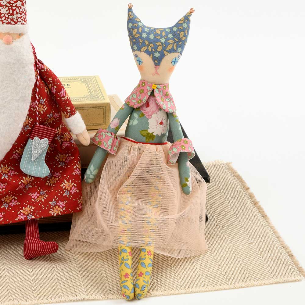 キット作り方つき(英語版)。北欧のデザイナーが展開する人気のファブリックブランド「ティルダ」。エレガントな花柄ファブリックを使った、つけ衿やカフスをつけ、チュールのスカートをはいた、おしゃれなネコのドールです。ふりふりしたスカートに、襟巻のおしゃれにコーディネイト。きちんとお化粧もほどこして、かわいいネコちゃんです。