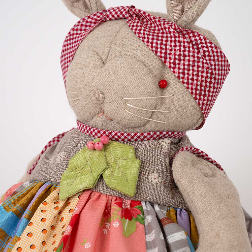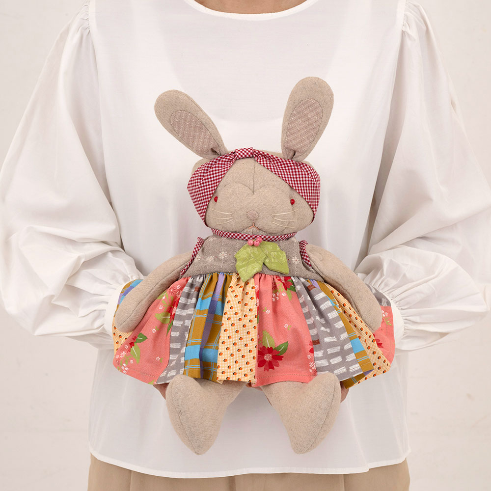 【キット作り方つき】可愛らしいボーダープリント布のワンピースとチェックのバンダナ、木の葉のブローチでおしゃれに。ウール地で仕立てる安定感のあるボディーも魅力の縫いぐるみです。