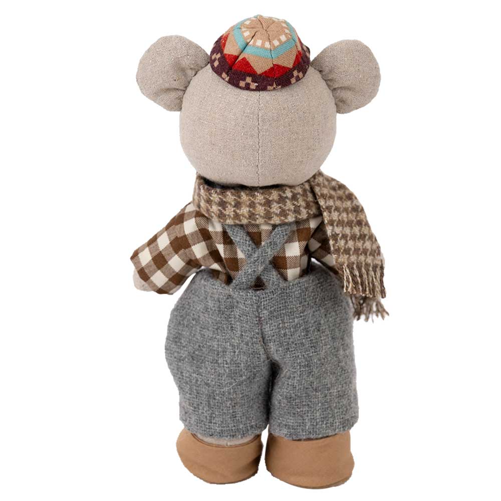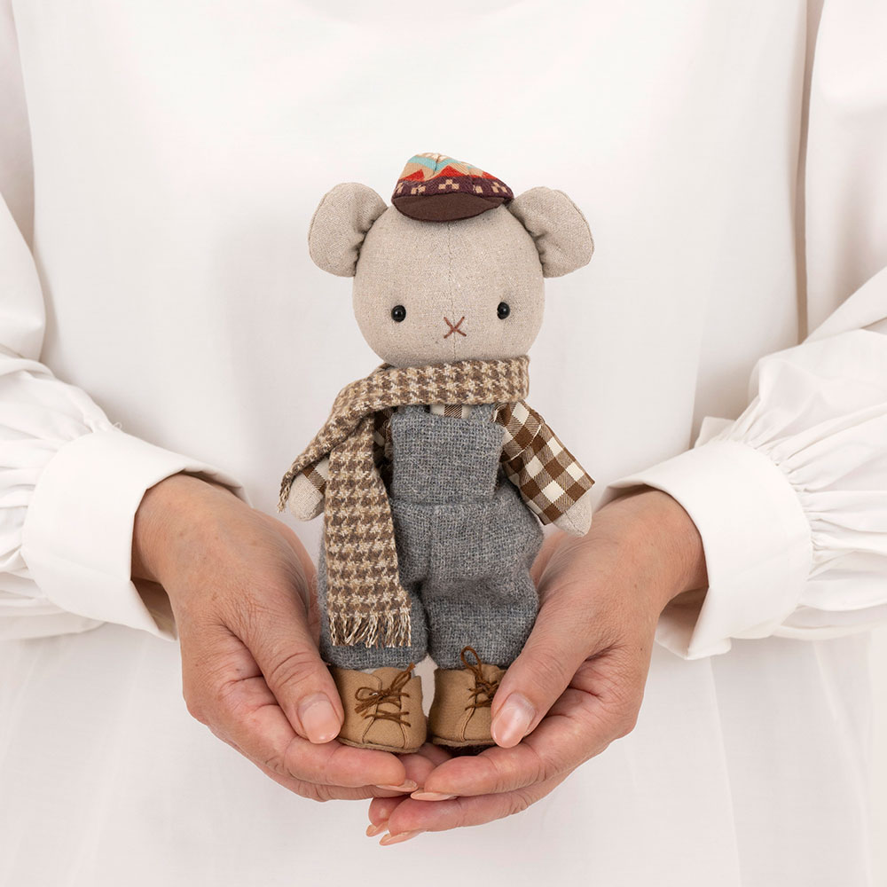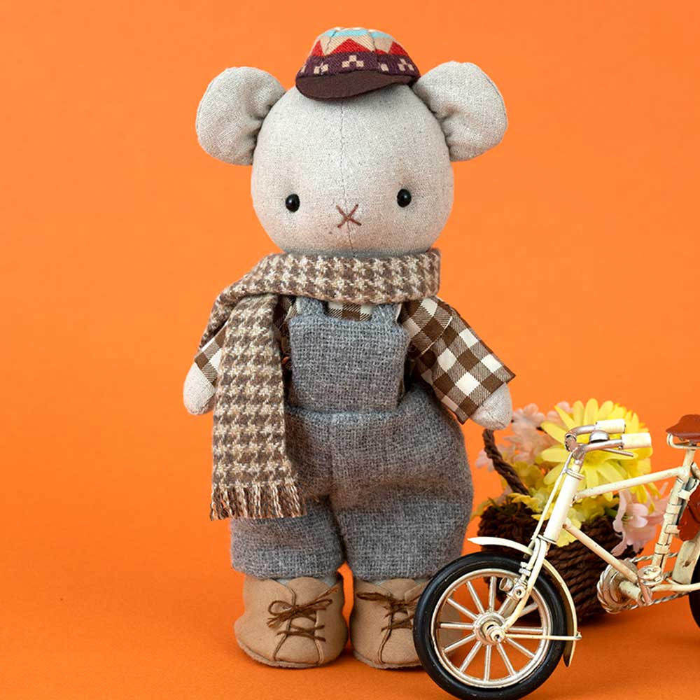 【キット作り方つき】帽子かぶってマフラー巻いて♪ お出掛け準備万端のクマの子。起毛素材で作るサロペットパンツもキュートです。組み立て式のスタンドつきでお届けします。